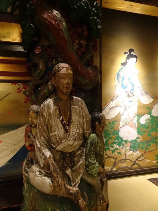 床柱は巨大な檜で、中国の漁樵問答の一場面が彫刻されているのだと。
