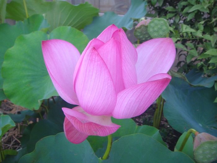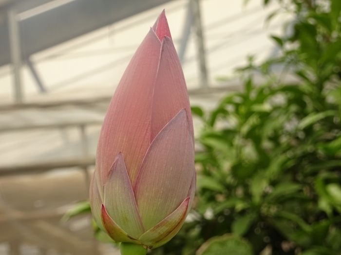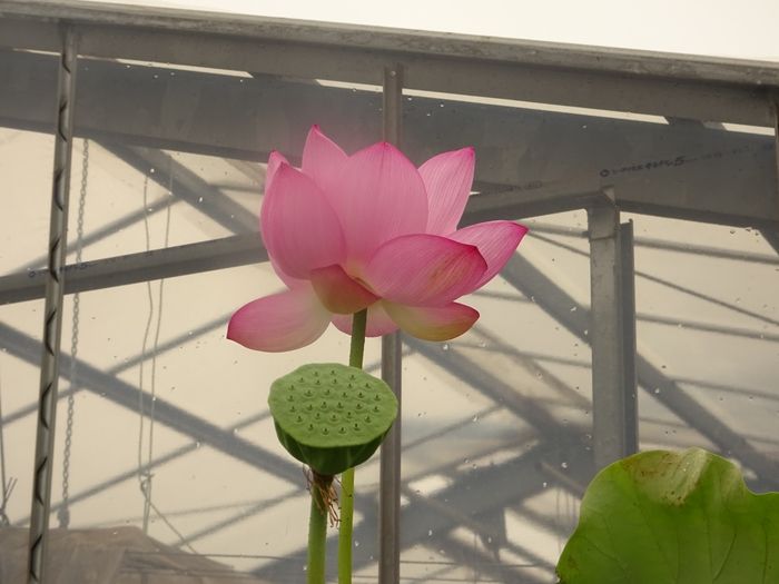 我が家の裏の、農家のビニールハウス前のハス(蓮)が開花しています。