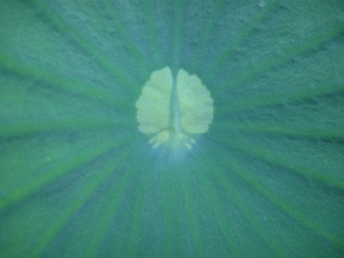 ハスの葉を観察しますと、葉の表面に真ん中に丸い小さなフタのような部分があります。