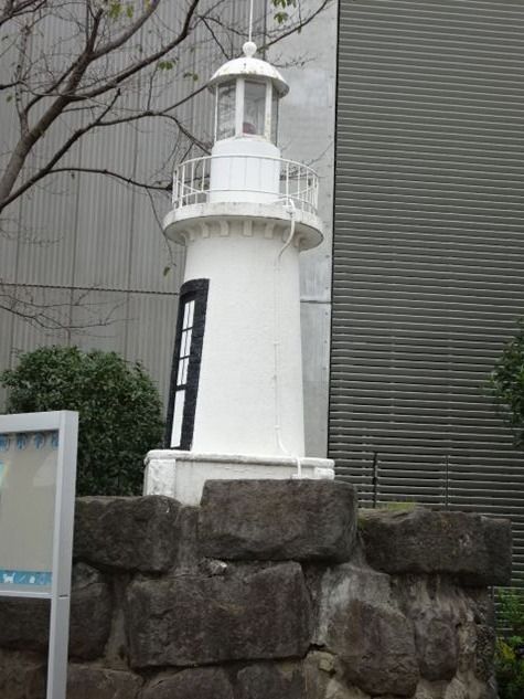 真鶴石と第2台場にあった品川灯台(国の重要文化財に指定され愛知県犬山市の明治村に移築)の