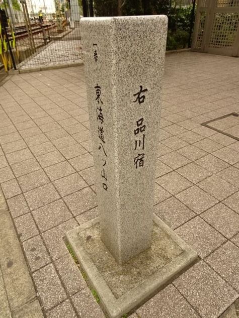 「一番 東海道八ッ山口、右 品川宿 左 品川駅」と刻まれた石柱。