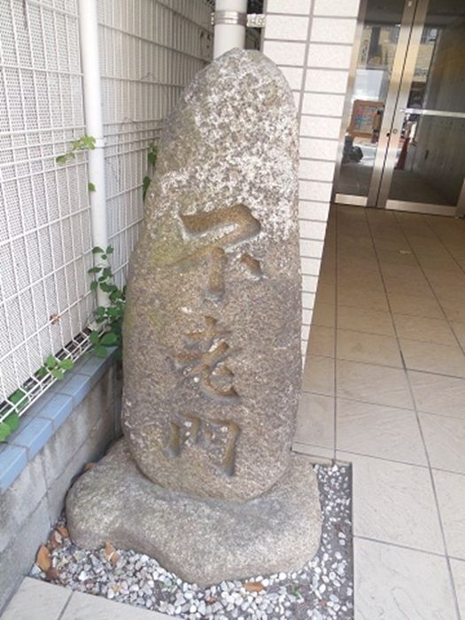 マンションの入口部分に、「不老門」と刻まれた石碑が。