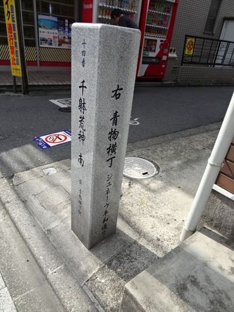 『十四番 千躰荒神 南そして右 青物横丁 ジュネーヴ平和通り』石柱。