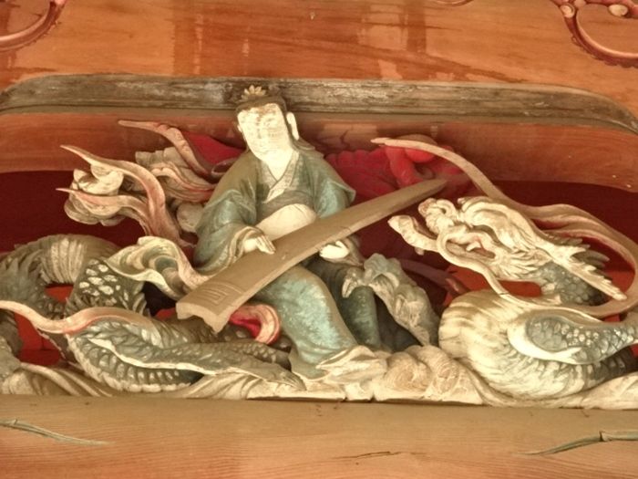 中央は龍と、琴を奏でる婦人の透かし彫り像が。
