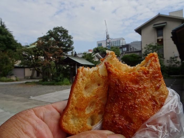 近くのパン屋で買ったカレーパンを千躰荒神堂の前にあった木造ベンチで楽しむ。