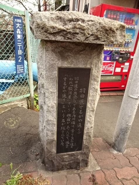 記念の銘板には、『羽田道(するがや通り)、羽田道の出発点である内川橋は、