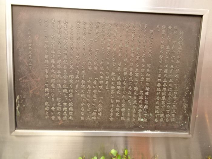 建てられ、円鍔勝三氏による彫像と嗣子・佐藤沙羅夫氏による揮毫の『青い背広で』の詩が刻まれる。