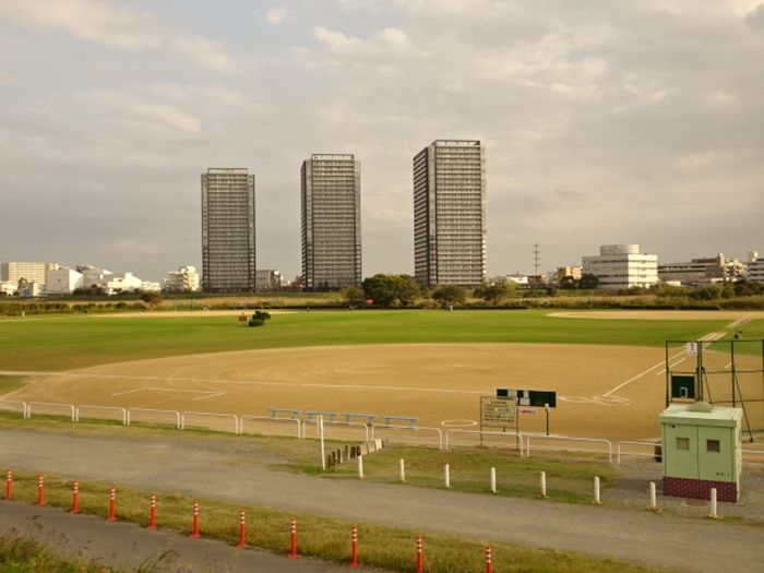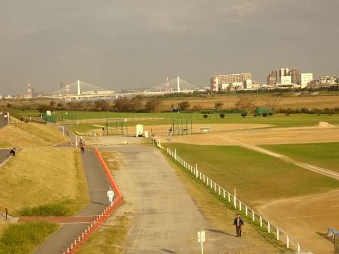 河川敷の多摩川六郷橋緑地野球場。
