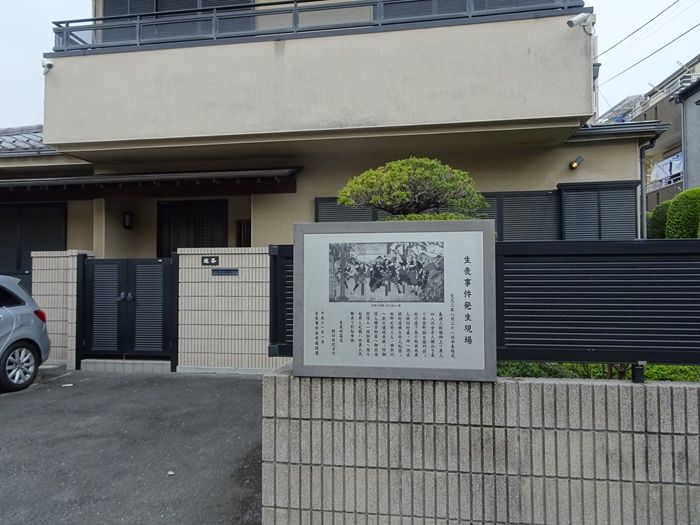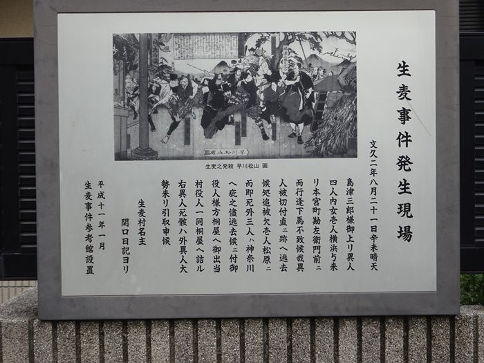 生麦事件の発生現場に、民家の塀に説明板が立っていた。