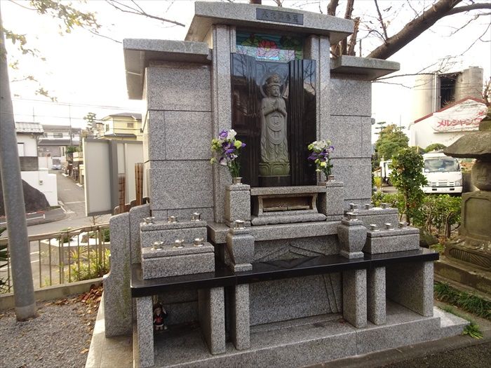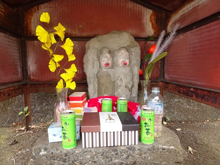 お顔は白く口紅も赤くひかれお茶やお菓子?そしてお花と銀杏の葉が手向けられていた。