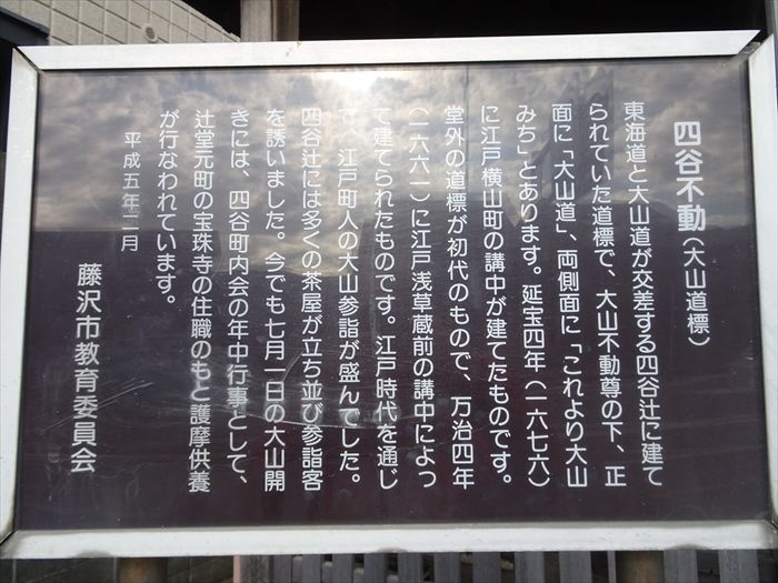 不動堂を挟んで左・東海道、右・大山道。鳥居は大山道の一の鳥居。
