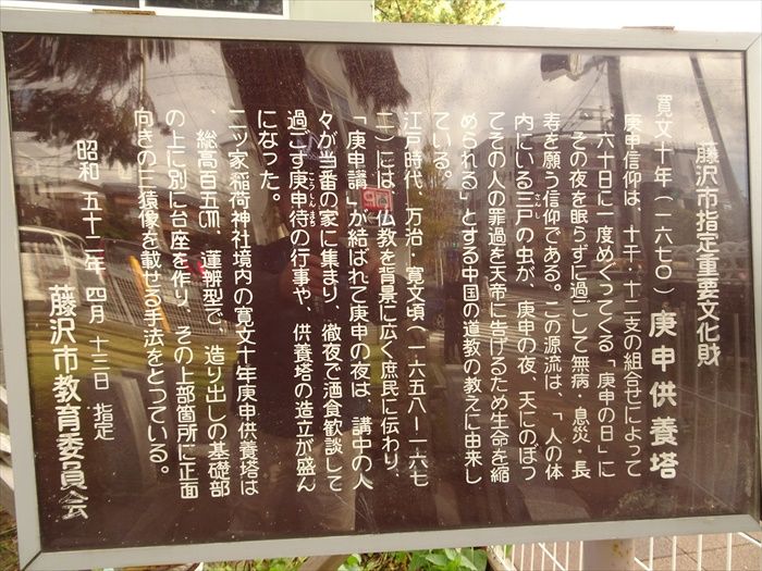 二ツ家稲荷神社境内の寛文十年庚申供養塔は、総高百五cm、蓮辧型で、造り出しの基礎部の上に