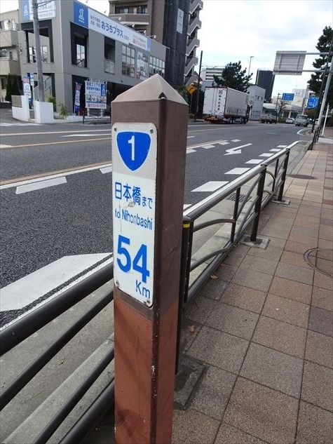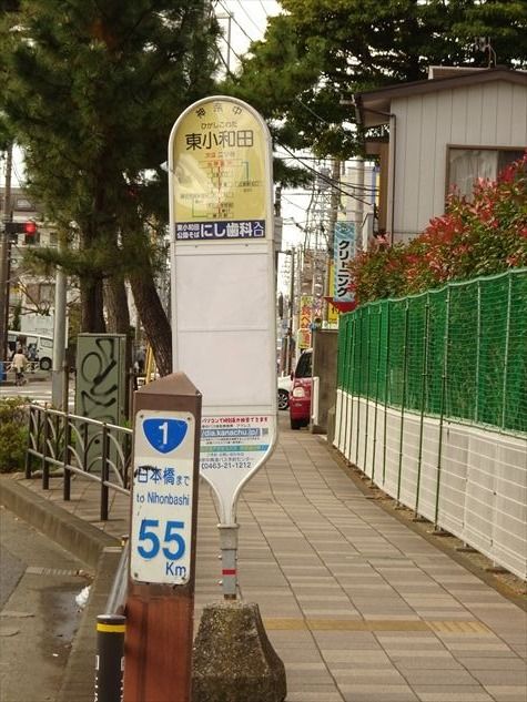 東小和田バス停の前が『日本橋まで(から)55Km』。