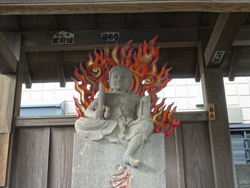 不動明王の後背の火焔は迦樓羅炎(かるらえん)と呼ばれるもので、不動明王が火焔の中に