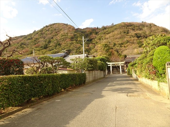「高来神社入口信号」を右に入った所が高来神社で、後の高麗山が御神体である。