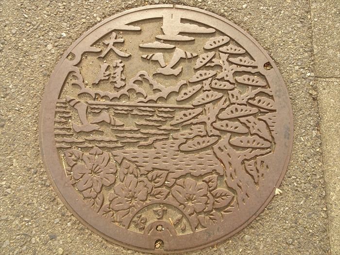 美しい大磯の海岸風景に、町の花サザンカと町の木クロマツ、町の鳥カモメのカラーデザイン。
