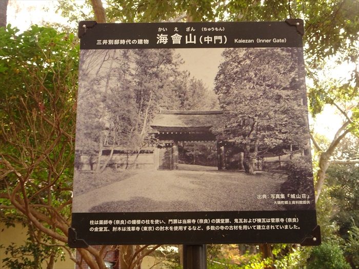 柱は薬師寺の鐘楼の柱を使い門扉は当麻寺(大和)の講堂扉、鬼瓦および棟瓦は菅原寺金堂瓦、