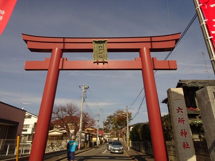 国道1号線に合流すると、『六所神社』の案内柱が。