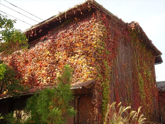 道路脇の建物の壁一面に紅葉した蔦?の葉が。