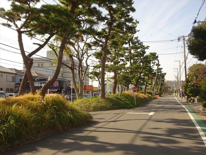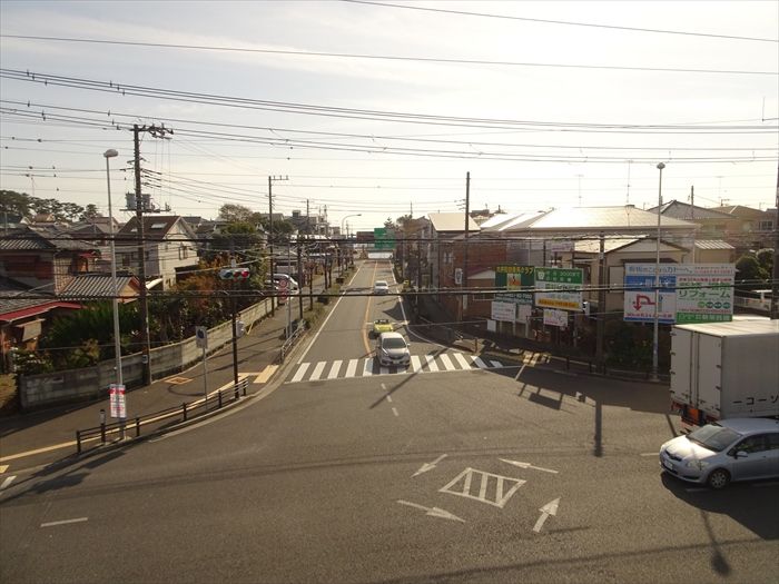 「二宮」交差点に架かる歩道橋の中央付近から、海岸にある西湘バイパス「西湘二宮IC」に