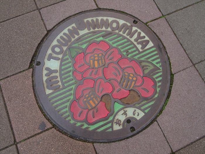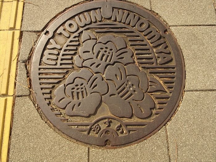 MY TOWN NINOMIYA の文字と、中央に町の木・椿の花のデザイン。「おすい」の文字入り。