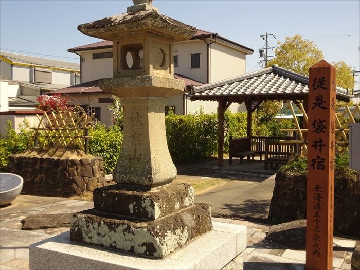 本町宿場公園の中に『従是袋井宿』の木柱と『秋葉山常夜燈』が。