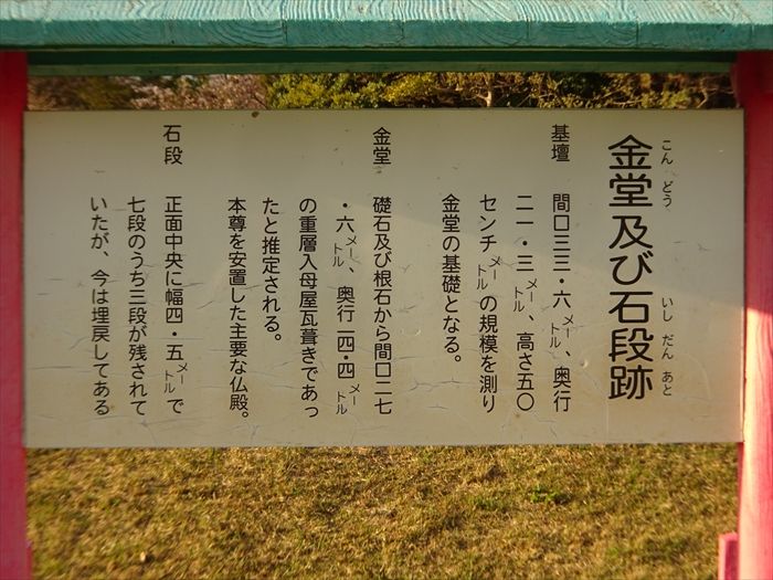 「基壇は間口33.6m、奥行21.3m、高さ50cmの規模を測り金堂の基礎となる。