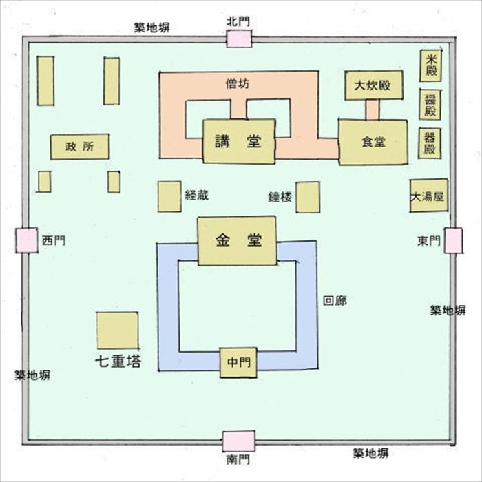 遠江国分寺は、金堂を中心に七重塔・講堂・中門・回廊など(伽藍)を築地塀などによって囲み、