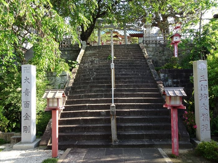 階段の上には明神鳥居(大正3年建立)と手水舎が。参道に鳥居がある珍しい寺。