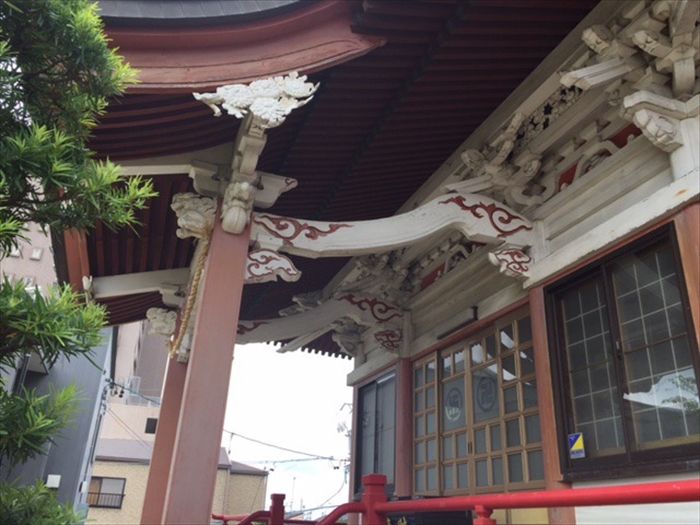 桁の木口が彫刻で隠され、朱色の模様も鮮やかであった。