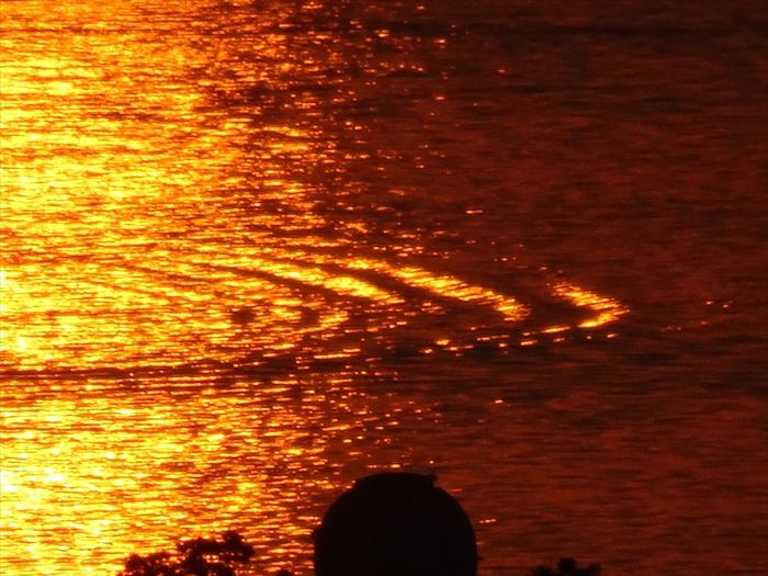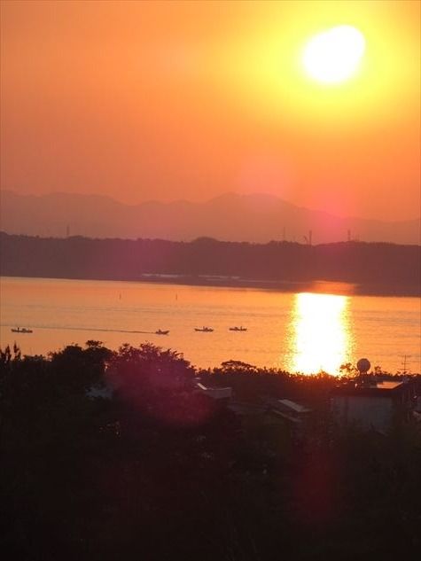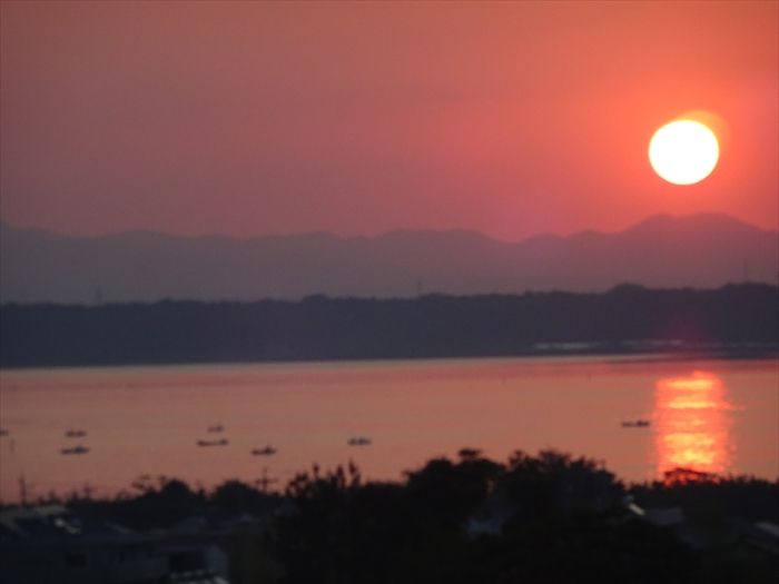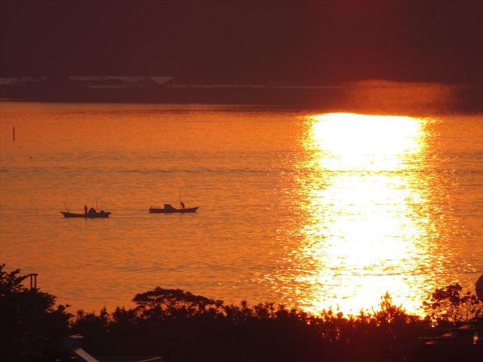 浜名湖も赤く染まり赤い光の帯が。そして光の帯の中に小舟が。