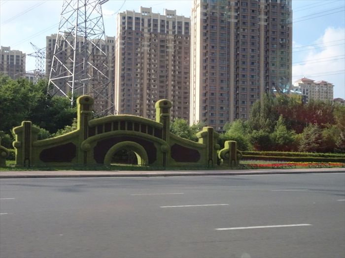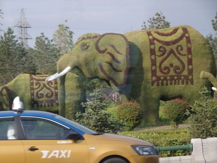 木々を刈り込んで作ったが如き見事なモニュメントが道路脇に。