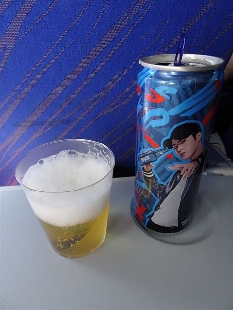最初はビールはないとCAから言われたが、なんとか1本GET。
