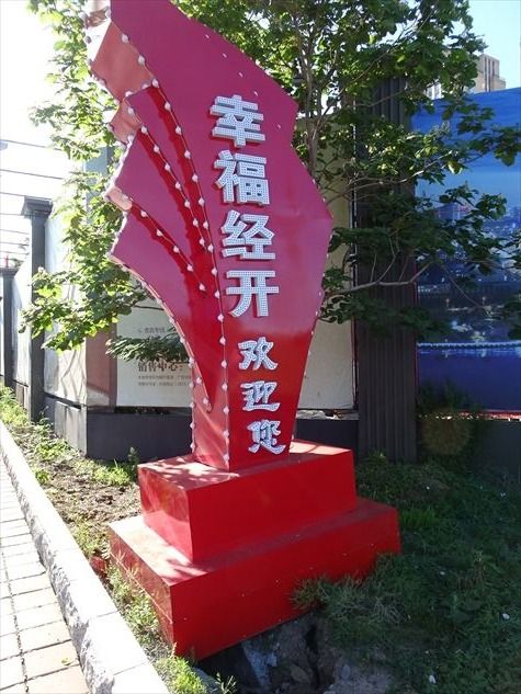 ホテル近くにあった『幸福经开 双迎您』と書かれたモニュメント。