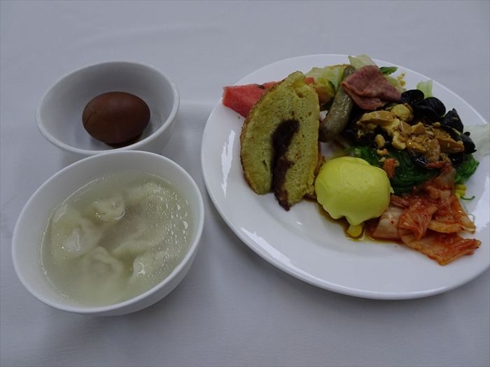 バイキング朝食を楽しむ。時間は7:32。