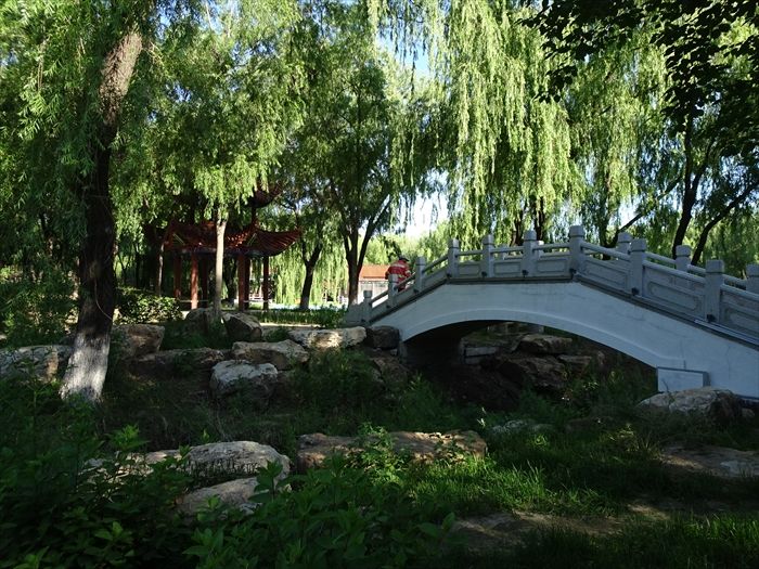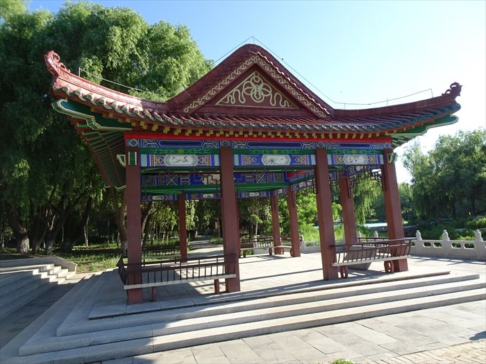 川沿いの公園(工事中)には中華風東屋が。