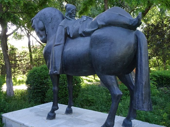 馬の上で横になって眠る老人の像。