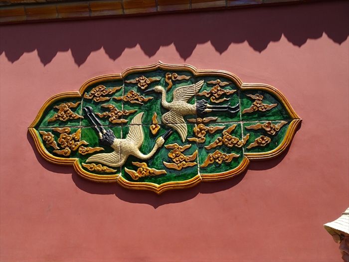 陶器で造られた壁の装飾。飛翔する二羽の鶴の姿。いくつかに分割された焼物。