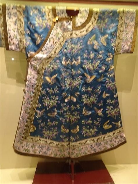 清王朝の女性のガウン、月の色のサテン、刺繍、折りたたみ、桃、蝶、ローブ。