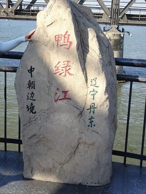 『辽宁丹东 鸭绿江 中朝边境』と刻まれた石碑。