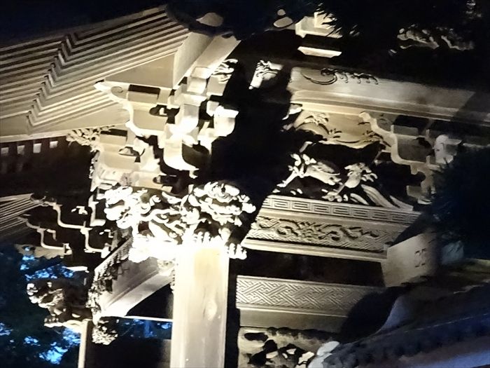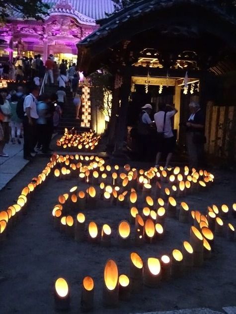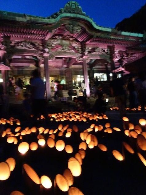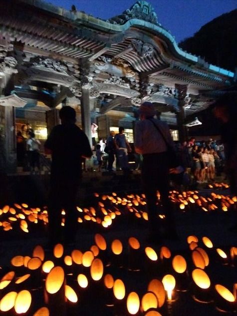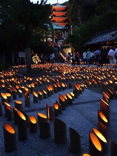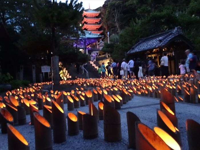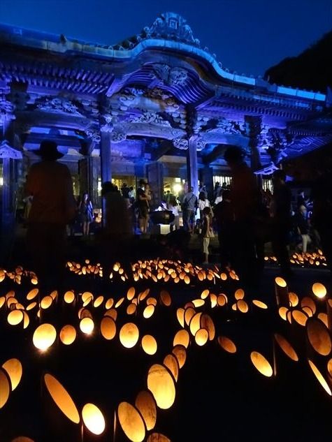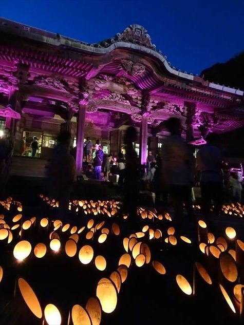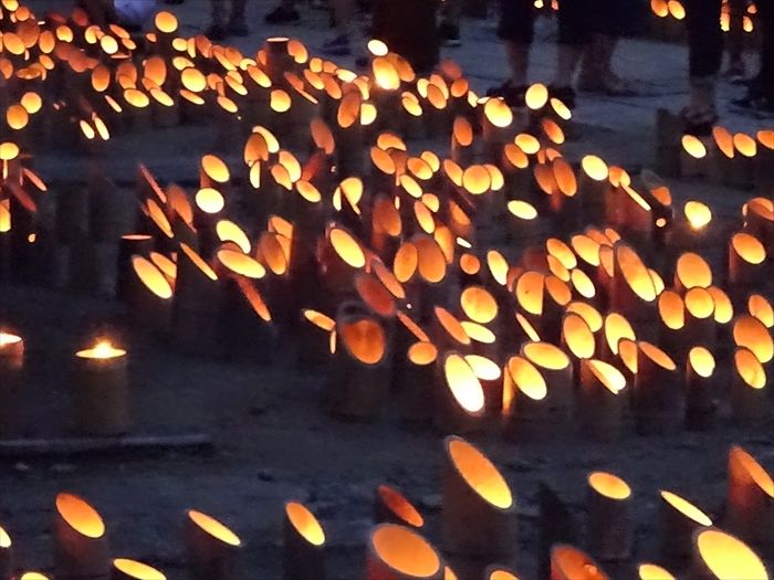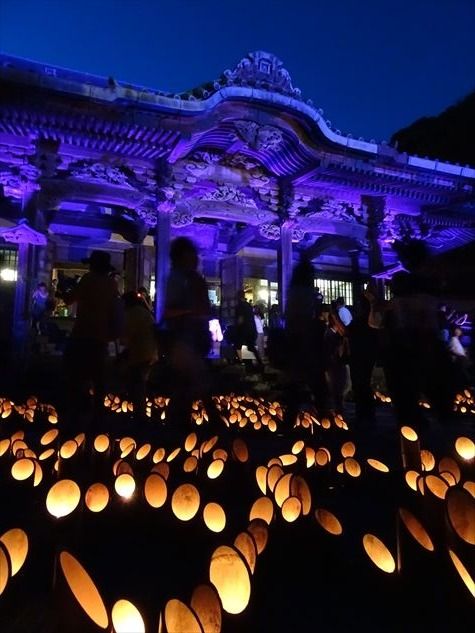 山門を潜ると境内には、灯りの灯った竹灯籠が一面に。