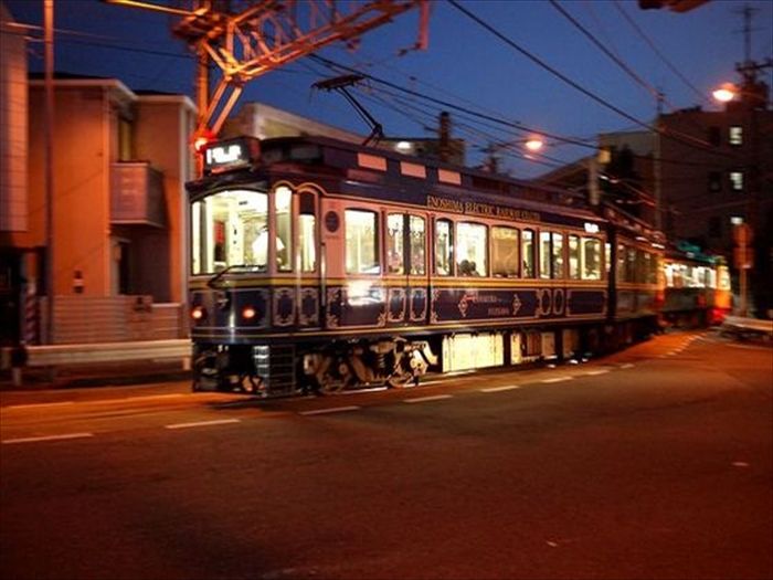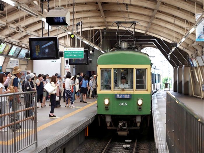 龍口寺前の三叉路を鎌倉方面に向かう江ノ電電車。