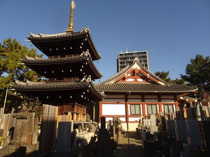 裏手の墓地には、昭和60年に再建された三重の塔が建つ。