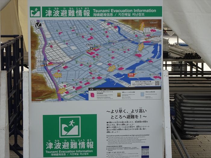 水色部分が浸水予想地域、ピンクが津波避難ビル。