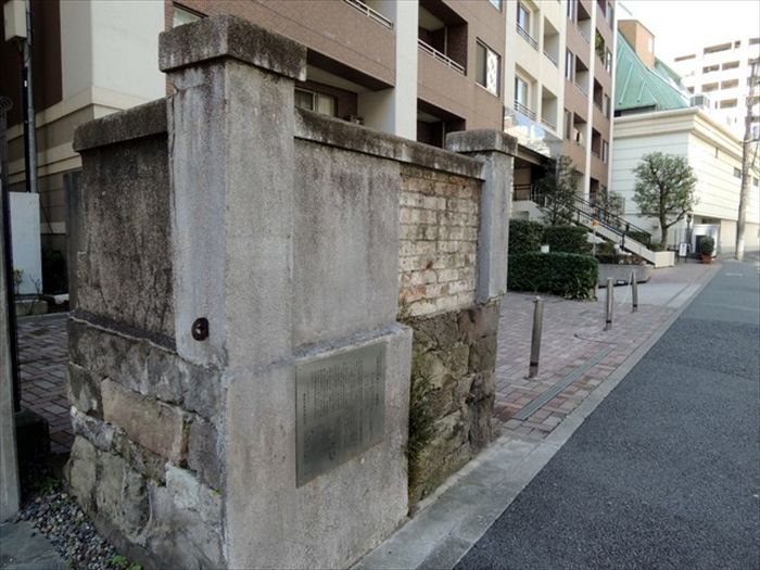 この塀は、煉瓦と石で出来ており、石造の腰壁部分の上に煉瓦壁が載る旧居留地の構造物の特色を
