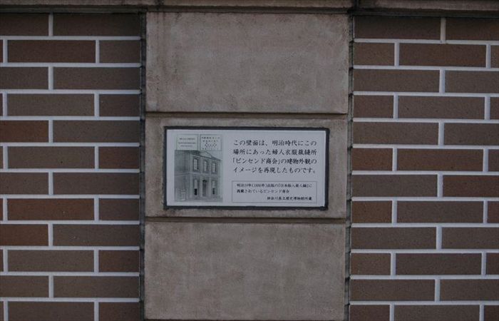 「この壁面は、明治時代のこの場所にあった婦人衣服裁縫所「ビンセンド商会」の建物外観の