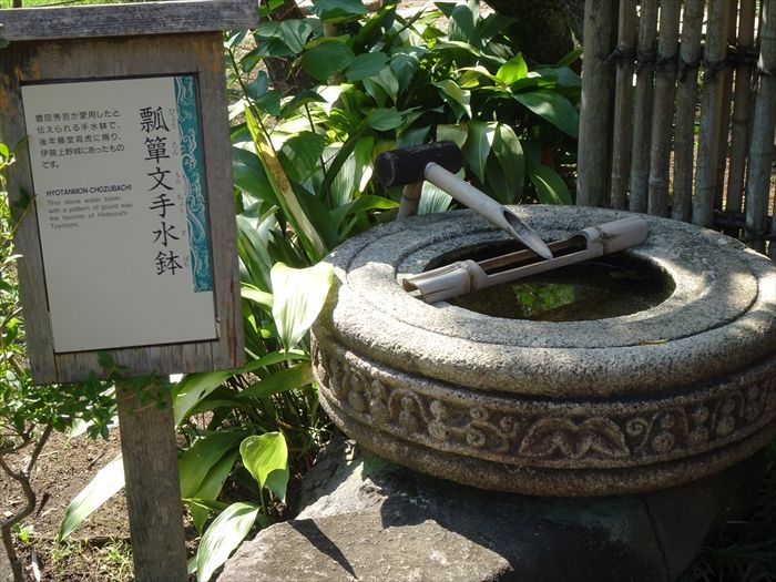 豊臣秀吉が愛用したという手水鉢(ちょうずばち)で周囲に瓢箪の文様がある。