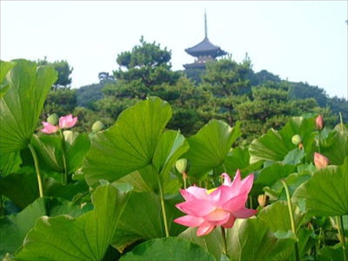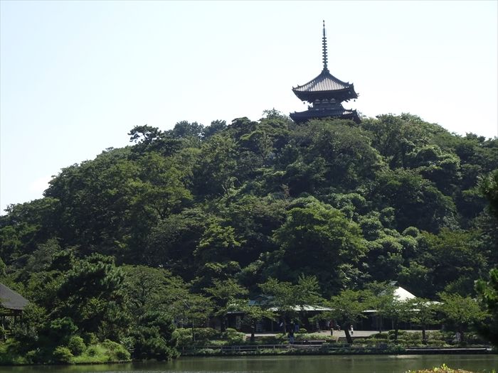 『大池』越しに『旧燈明寺三重塔【重要文化財】』を見る。