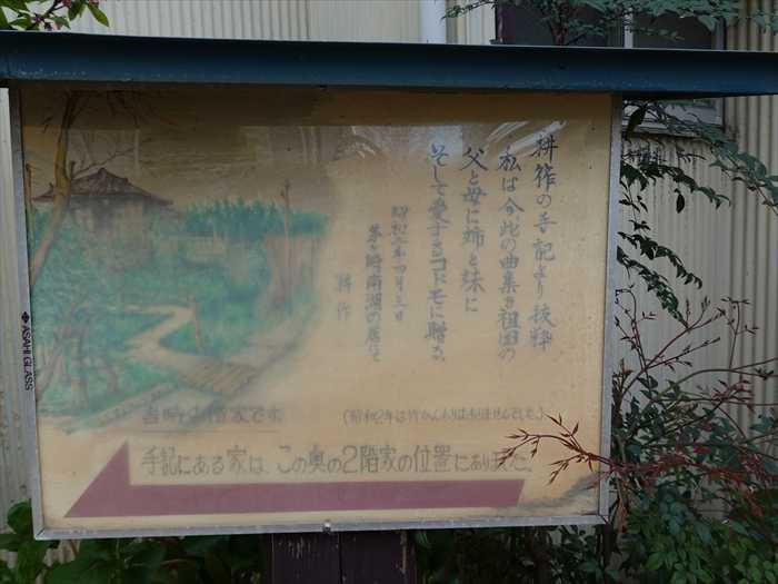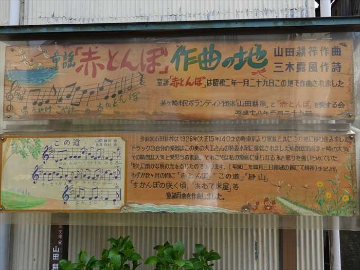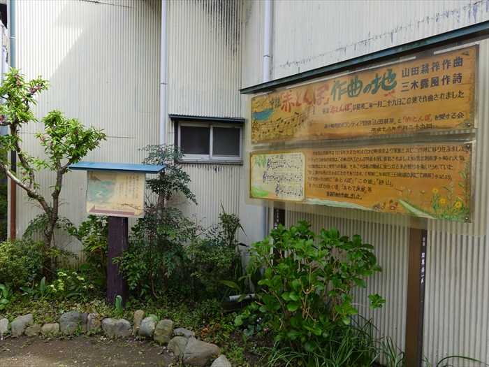 そして次に訪ねたのが 材木屋の建物の裏手にあった 「赤とんぼ作曲の地」案内板。