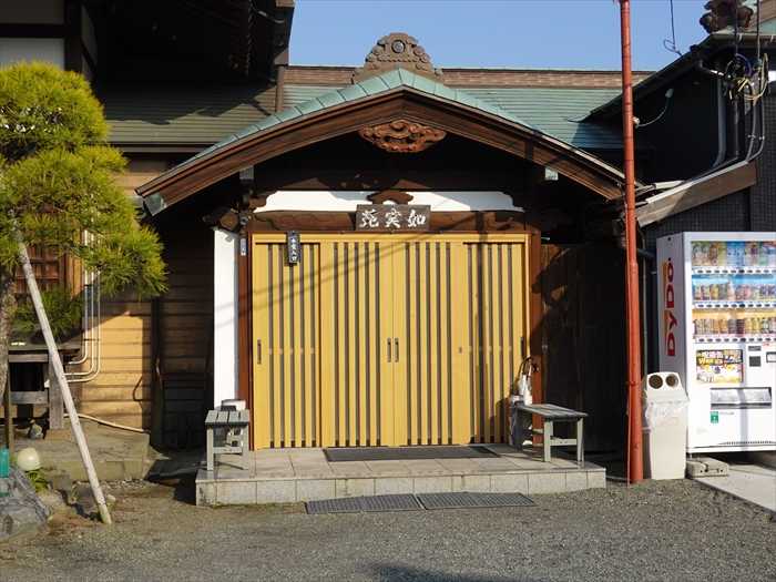 「本堂」の右手にあった「如実苑」。「本堂入口」の案内板があった。